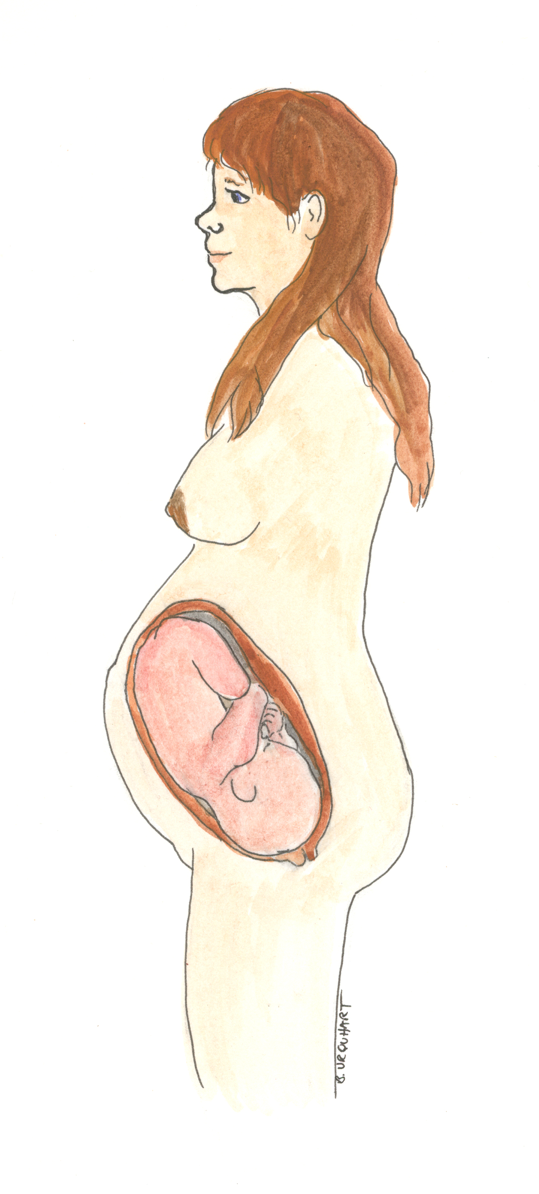 Рисунк 1. Во время беременности органы и скелет матери приспосабливаются к растущему плоду. На поздних сроках матка значительно увеличивается в объёме, что вызывает смещение и сдавление окружающих тканей. Например, на рисунке показан боковой срез тела женщины на позднем сроке: видно высокое положение диафрагмы и сжатые внутренние органы. Эти естественные изменения могут приводить к различным болям из-за давления и растяжения 2.